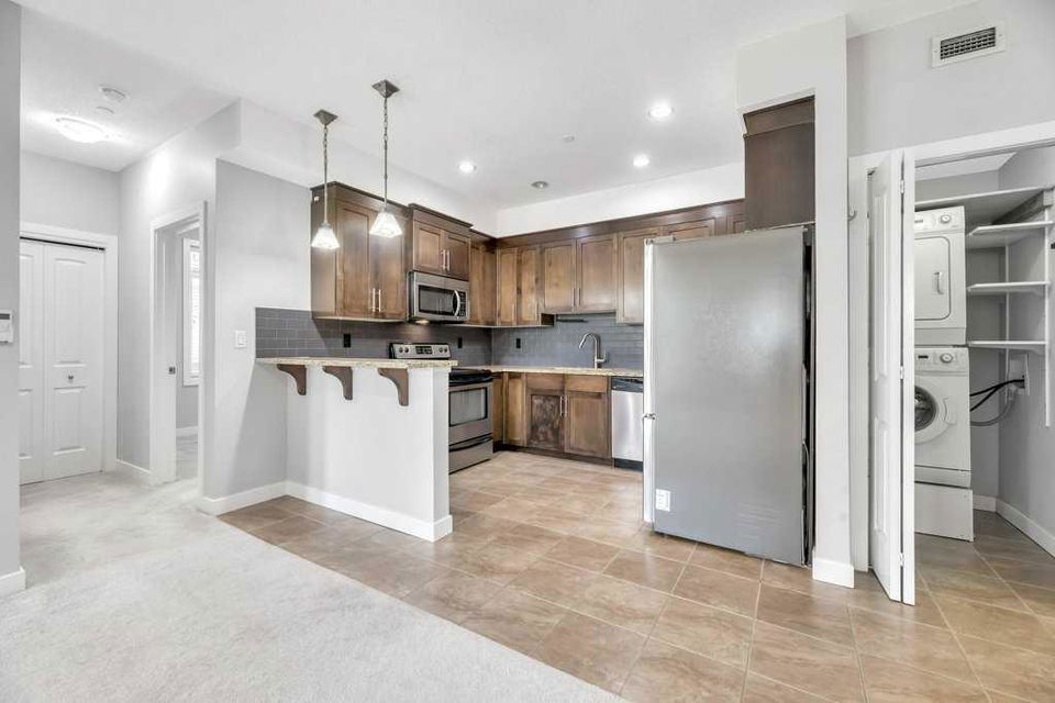 Spacious and bright, this over 900 sq ft corner condo offers comfort and convenience in a fantastic layout. The open floor plan features a welcoming living room anchored by a corner gas fireplace, perfect for cozy evenings. The kitchen is well-appointed with new stainless steel appliances, granite countertops, and a breakfast bar that’s ideal for casual dining or entertaining. With 2 bedrooms and IN-SUITE laundry, the unit balances practicality with style. Step outside to a large private patio, a rare find for condo living. This home also comes with the bonus of THREE titled parking stalls—TWO underground and one surface level—plus the comfort of air conditioning for warm summer days. A great opportunity for first-time buyers, downsizers, or investors!