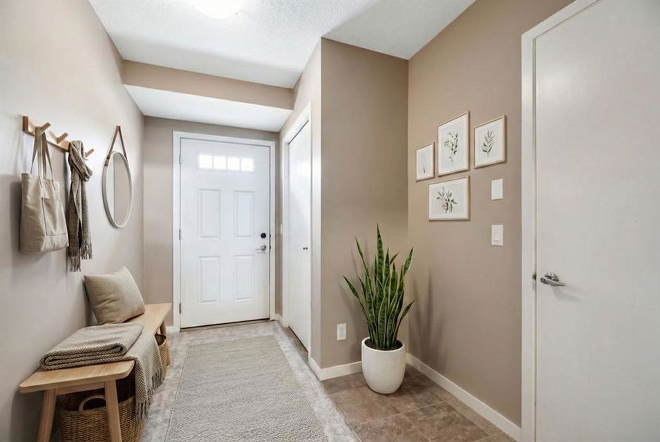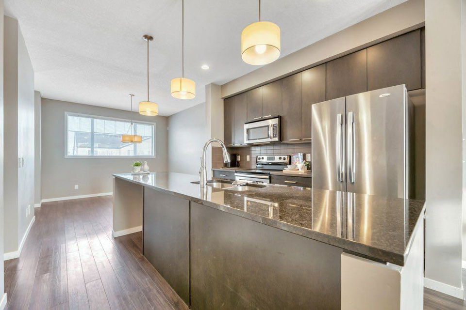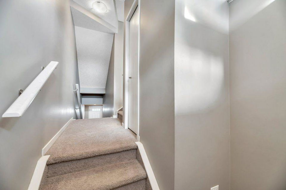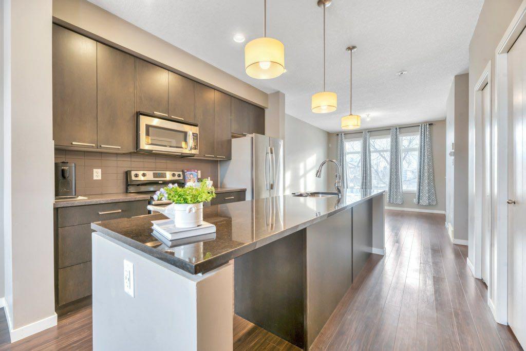 This bright, open and spacious townhome is located in the popular community of Copperfield where you’ll have easy access to every amenity you could dream of. This thoughtfully designed layout has you entering the front foyer complete with coat closet with the main floor being a few steps up creating a nice separation. The main living space is flooded with natural light and boasts 9’ ceilings and an open floor plan. In the centre kitchen you’ll enjoy a neutral palette with sleek dark cabinetry, granite counters, a nice sized island with seating and stainless steel appliances. The kitchen flows seamlessly into the dining room which includes a cozy nook that you can use as an office space or maybe a trendy coffee or drinks bar. Upstairs you’ll find 2 generous bedrooms each with a huge walk in closet. The 4 pc primary ensuite has a tub & shower combination while the main bath includes a walk in shower offering you the best of both worlds. You’ll also appreciate the convenience of upstairs laundry. Don’t overlook the luxury of the attached single car garage allowing you and your car to stay sheltered from the elements year round. There is also an additional parking spot on the driveway plus there are multiple visitor stalls located directly across from your front door. This terrific unit is in a well maintained complex in a prime location close to schools, parks, playgrounds Copperpond and transit. Plus you’ll have easy access to Stoney Trail making for an easy commute to virtually any part of the city. Don’t miss your chance to call this one home! This home is vacant and move in ready making a quick possession possible. (Home has been virtually staged in some photos.)