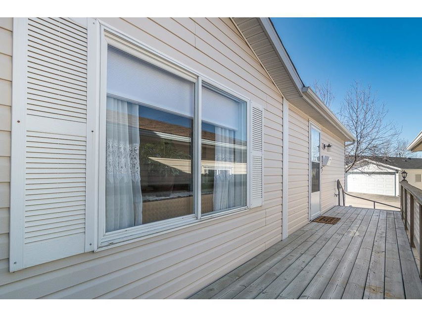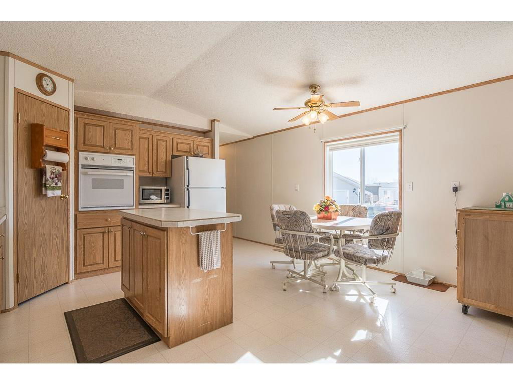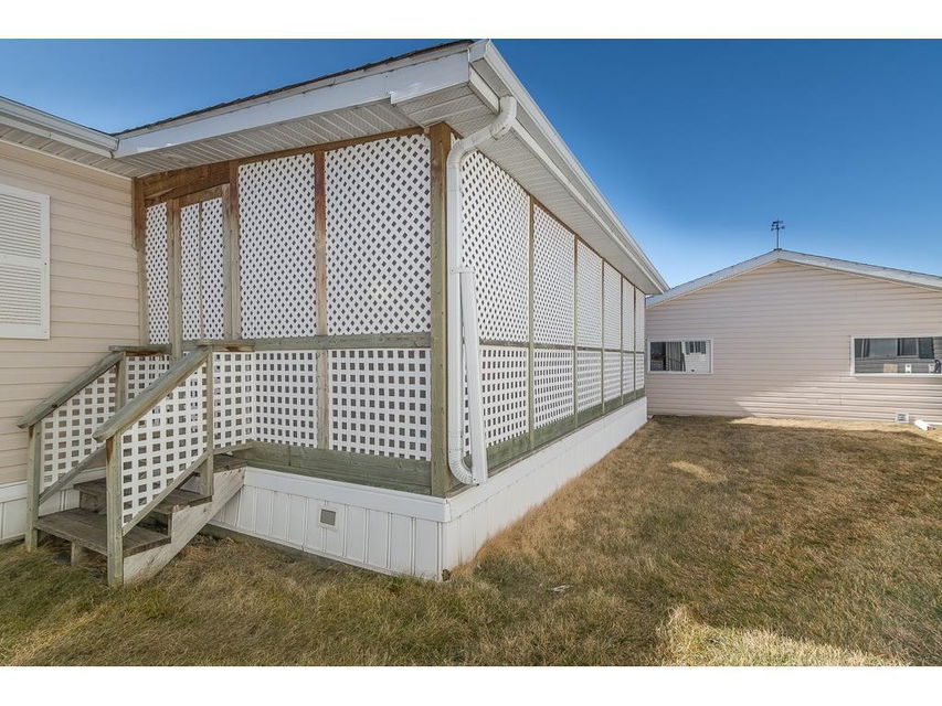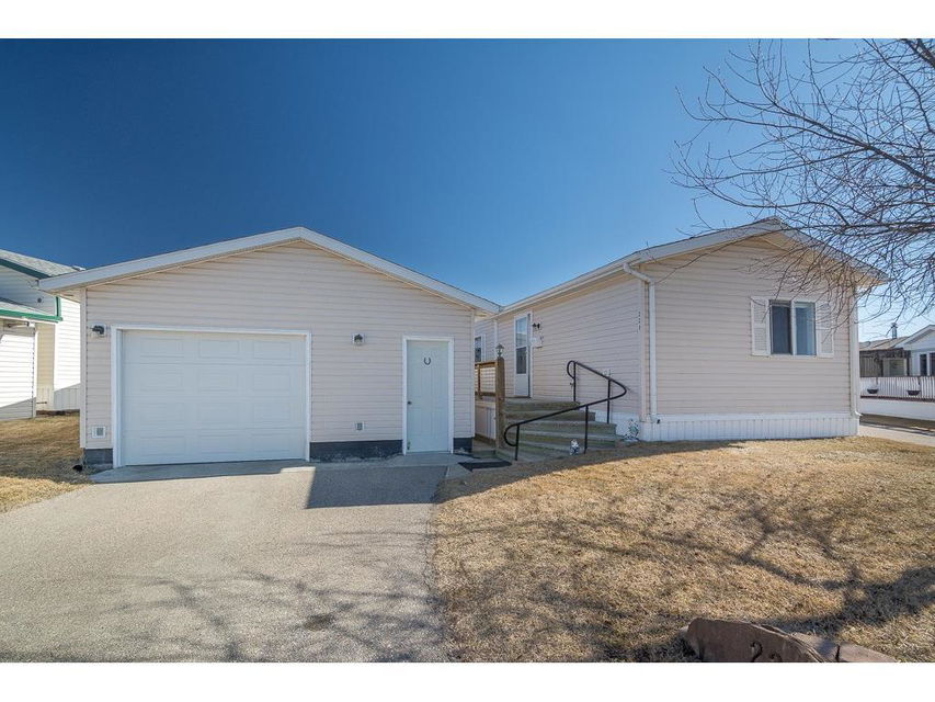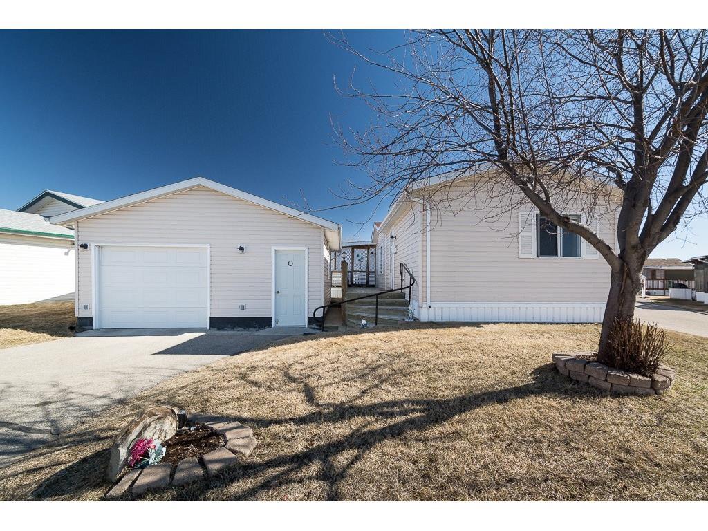 Welcome to the lovely Adult, Gated Community of Ranch Estates. This 3 Bedroom, 2 Bathroom home has an open-concept Living Room, Kitchen, Eating area, is bright and roomy. In the Kitchen, you’ll find lots of cabinets and counterspace, a corner pantry and an island. Enjoy the LARGE Deck of which 23’x10′ is covered, cozy and private, a wonderful spot to read, have coffee or enjoy tme with friends. There is a single Detached Garage and parking pad which will accommodate 2 additional vehicles. Some of the amenities this park offers are groomed greenspaces, a community garden, on-site Park Manager, and Club House..and is located close to walking paths and the beautiful Kinsmen Lake Park.