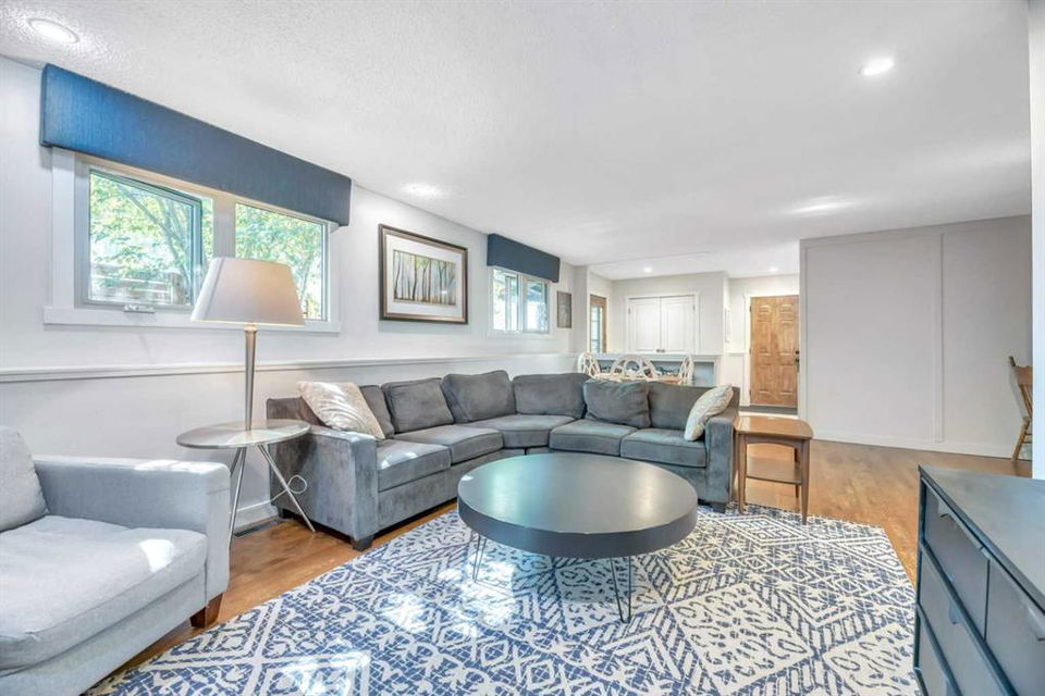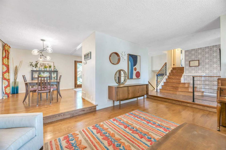 Welcome to this stunning split level home showcasing timeless brick curb appeal and a private, treed backyard that’s beautifully landscaped for both relaxation and entertaining. Step inside and you’ll find modern touches throughout—sleek lighting, contemporary railings, and a perfect mix of hardwood and tile floors. The bright white kitchen is a chef’s dream, featuring an island with granite countertops, a gas stove, and seamless flow into the dining area—perfect for family meals or hosting friends. At the front of the home, the living room offers a warm, welcoming space to gather.