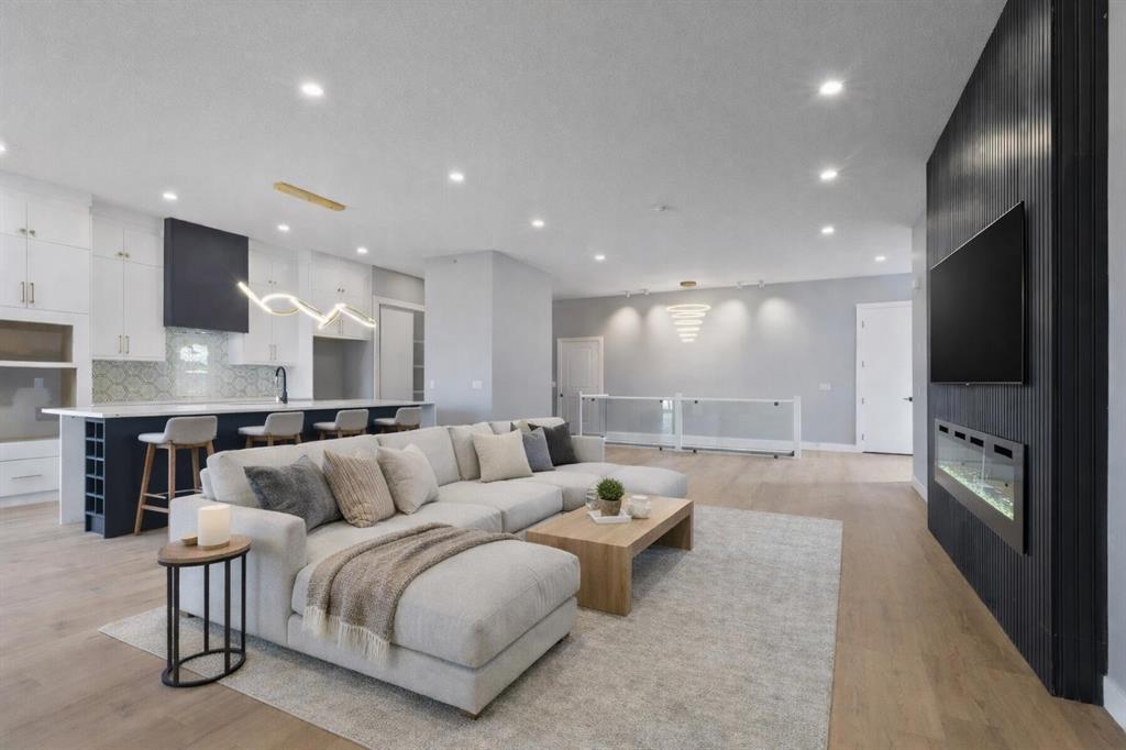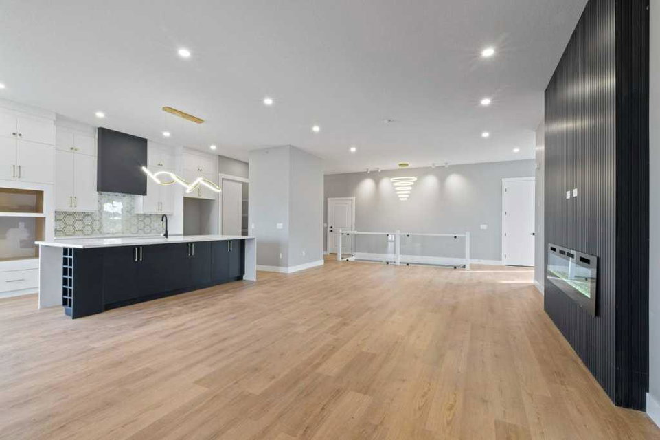 Step inside to soaring ceilings and a bright, wide-open floor plan featuring designer finishes throughout. The showpiece kitchen is anchored by a striking navy island, expansive quartz countertops, upgraded cabinetry, premium lighting, and an oversized layout ideal for entertaining. The living room is equally impressive with a dramatic floor-to-ceiling feature wall fireplace, creating a sophisticated focal point for the main living space.