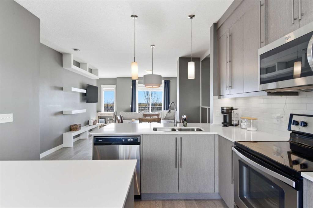 Like new townhouse condo with a smart, functional layout and high ceilings throughout. This unit offers 2 primary suites, each with its own 4-piece ensuite — ideal for roommates, guests, or shared living. The main level features a flex room that works well as a home office, gym, or additional bedroom. The second level has an open floor plan with a large centre island, quartz countertops, and plenty of cabinet and counter space. Bright and practical for everyday living and entertaining. Double attached garage provides secure parking and extra storage. Excellent location backing directly onto the canal with immediate access to the walking paths that run along the water and wrap around the south end of Chestermere Lake. Enjoy everything Chestermere has to offer plus the amazing access to all quadrants of YYC!