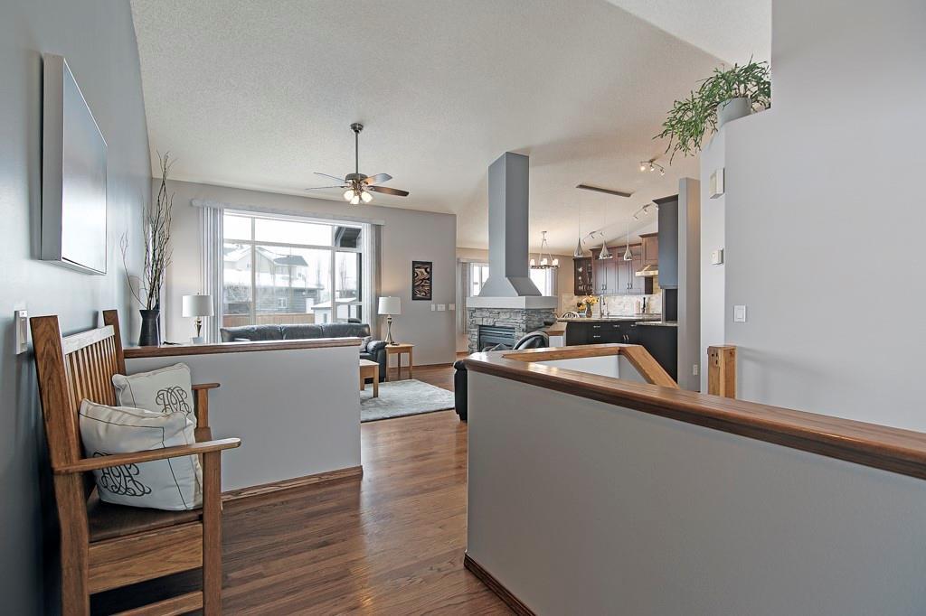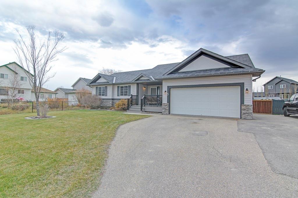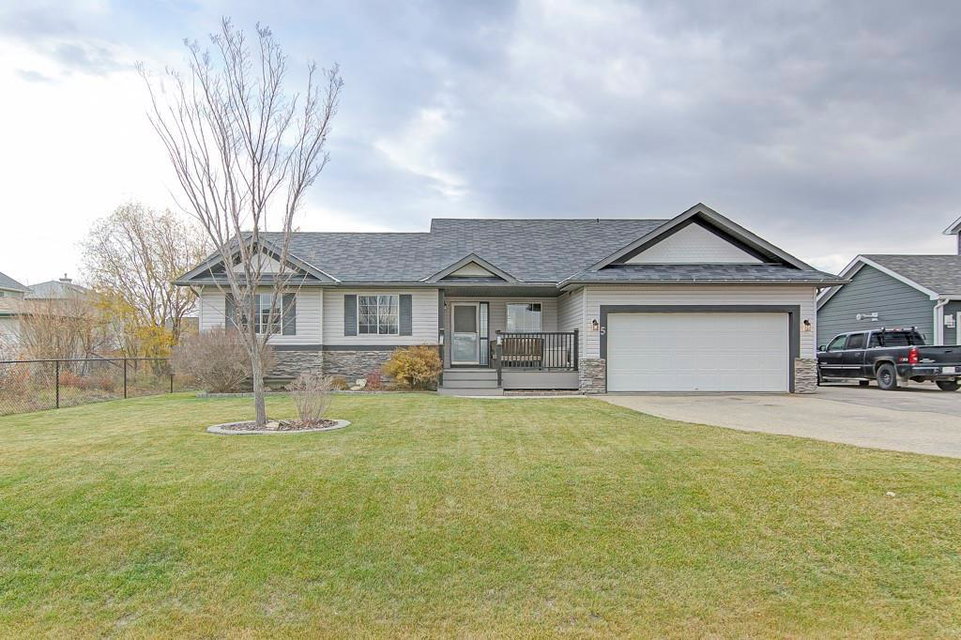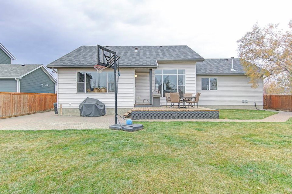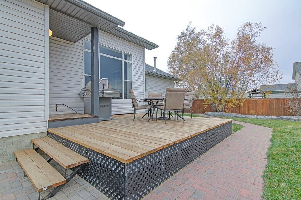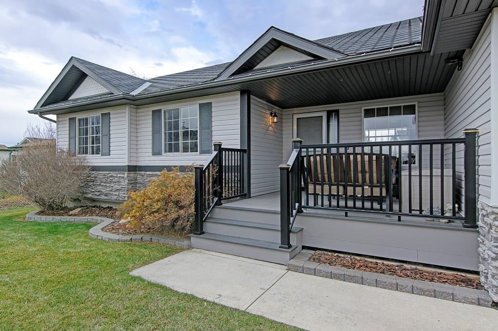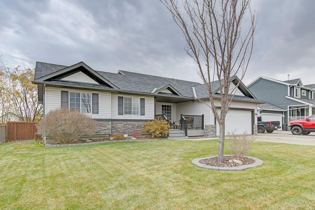 This bungalow shows 10/10! A FRONT VERANDA GREETS YOU… SIT AND ENJOY SUNSETS..across from a green space …Big and bright, this home is sure to impress.Only Minutes to Calgary and Chestermere. HARDWOOD floors throughout main floor. Vaulted ceilings in living room with 2 sided fireplace. GOURMET kitchen with rich cabinetry, STAINLESS steel appliances, GRANITE countertops, corner pantry and centre LARGE ISLAND open to eating nook. Master retreat with 3piece ensuite and walk in closet. 2 more good sized bedrooms, 4 piece bath. MAIN FLOOR laundry area. NEW carpet with transferable 25 year warranty. Lower level is completely developed with LARGE FAMILY room,GAMES AREA & wet bar, additional bedroom, HOME OFFICE, 4 piece bath and storage. Massive backyard with NEWER deck and room for a garden, firepit and more! All this in the great hamlet of Langdon. Pride of ownership shown throughout.